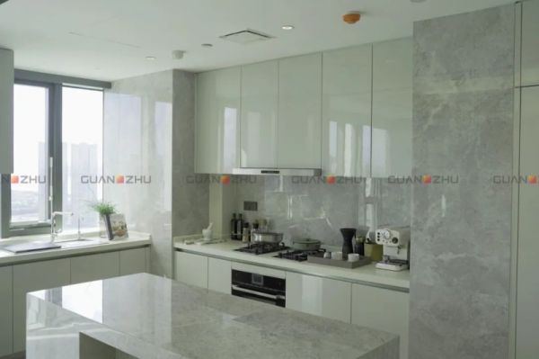 厨房空间呼应全屋色调,墙面铺贴冠珠玛雅灰抛釉砖,1:1还原真石质感,纹理清晰自然,光洁亮丽的釉面在视觉上提升空间明亮度,抛釉砖低吸水率、防污耐潮的特点轻松hold住厨房油烟,让瓷砖历久弥新。地面铺贴与客餐厅同色系瓷砖,柔光色调沉稳静谧,在深浅自然对比之间,隐奢感呼之欲出。瓷砖与橱柜、吧台多种材质交融碰撞,颜值力MAX,赋予厨房烹饪之上更多设计美学价值。
