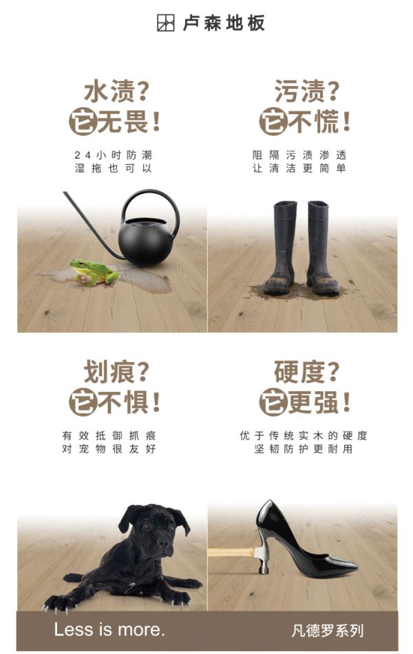 除了外观,凡德罗地板优质的性能更让人赞叹。好的地板就是可以长久的为空间打造精致度与舒适感。凡德罗系列地板突破性的采用三大黑科技,将抗冲击、耐刮擦、耐脏污、防潮等实用性与美观性完美结合在一起,给家居带来更轻松、愉悦、舒适的生活体验。无惧水渍、污渍和划痕的侵袭,地板的硬度也远远优于传统实木地板的硬度,让消费者使用起来没有负担,可以舒适自由地享受品质生活!