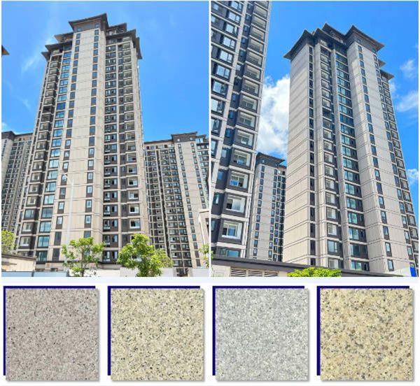 铃鹿多彩印象石使用了柔性底色骨材漆,通过对骨材级配以及乳液配方的精研,确保骨材可呈现逼真的质感造型以及优异的抗裂性,成就逼真烧面花岗岩纹理