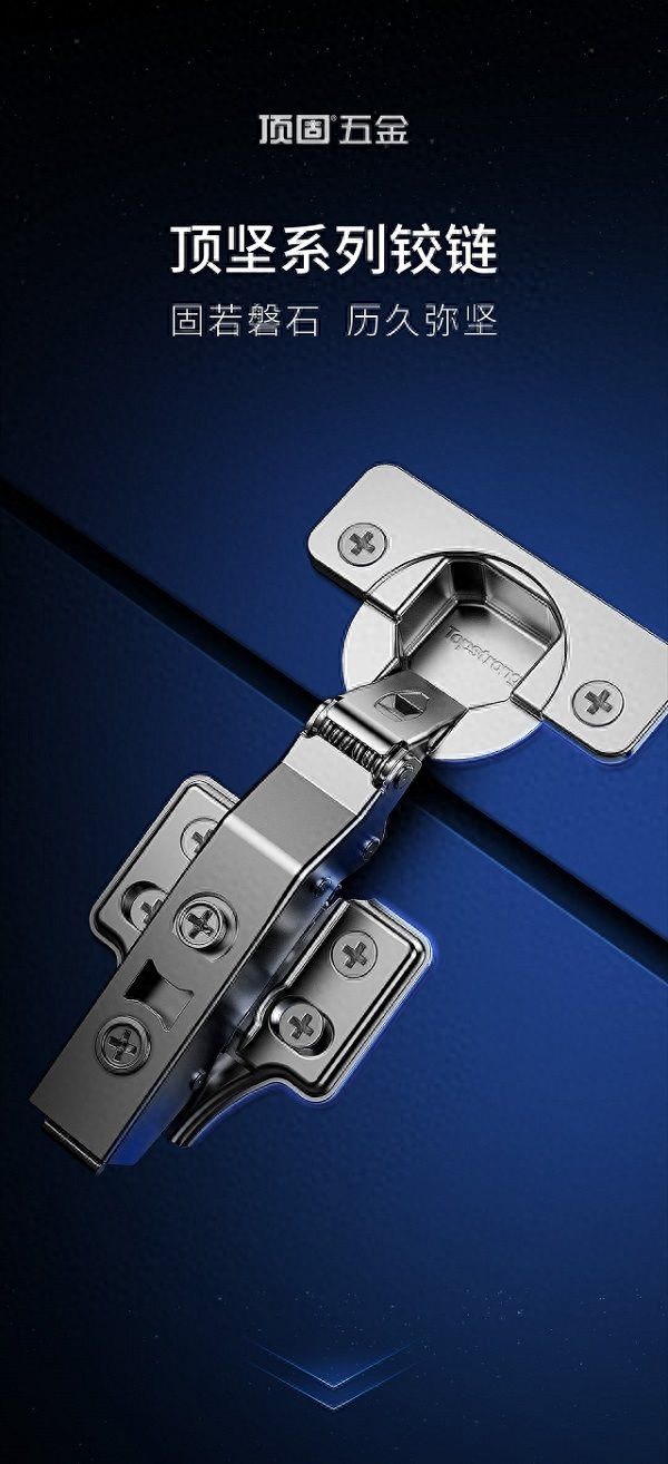 顶固顶坚系列较链有冷轧钢及不锈钢两种材质可供选择,一次冲压成型,手感厚实,表面光滑,而且表面采用镀铜层、镀镍、抗氧化层等多层电镀工艺,所以不易生锈,坚固耐用,承重能力强,使得橱柜门开合自如,不会出现门关不严实的情况。而劣质铰链使用一般薄铁皮等廉价金属焊制而成,柜门拉伸生涩,几乎没有回弹力,用的时间稍长便会失去弹性,导致柜门关不严实,甚至开裂。