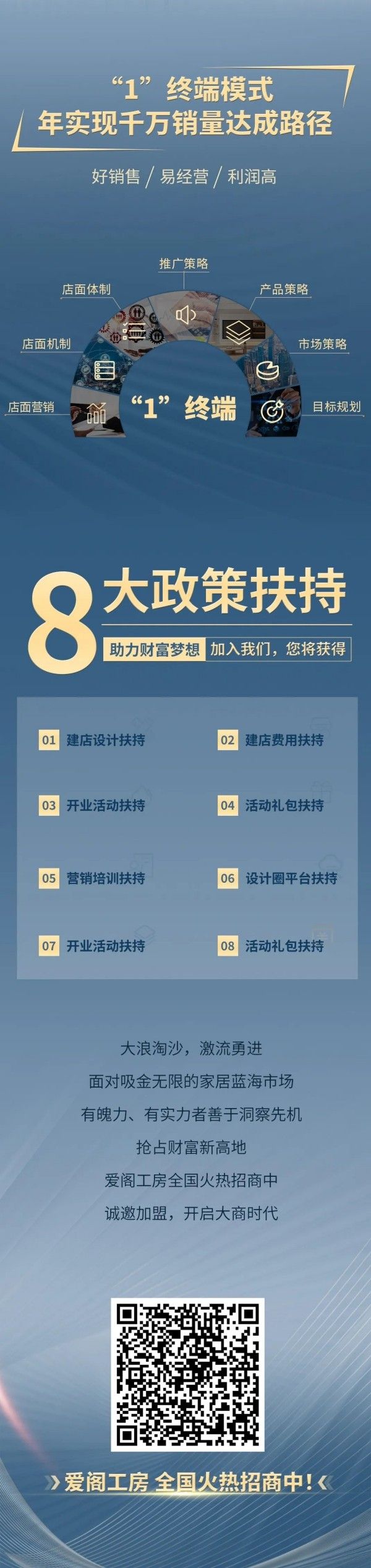 爱阁工房,20年定制名实业,集研发、设计、生产、销售、服务为一体,业务覆盖全屋整装、全屋定制,多品类产业链,200+风格系列,精准匹配客户需求,甄选功能型健康环保板材,负离子板及ENF负离子板,可持久释放负氧离子,净化空气,净化甲醛,抗菌抑菌,真正做到即装即享 负离子空间,更具行业优势。全+模式聚焦赋能新商,实战型商学院营销培训,专业渠道运营团队全程扶商,8大补贴政策扶持,12:1全案终端运营服务支持,打造标杆门店,业绩全面提升,单店实现1000万+年销量。目前爱阁工房正在火热招商,诚邀全国优秀新商共建合伙人事业,与您一同开启致富模式,共创共赢共享财富!