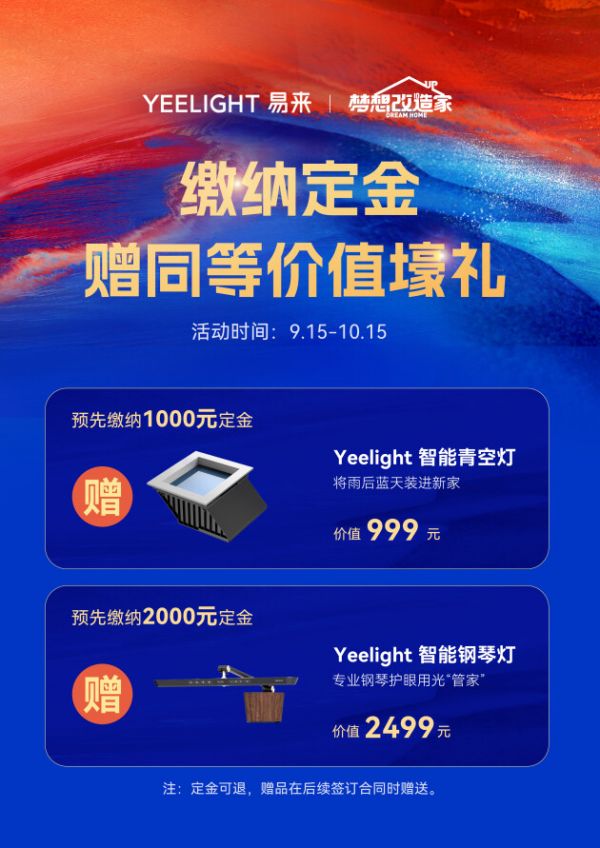 除了超高性价比的《梦想改造家》同款套餐,易来推出缴纳定金赠同等价值壕礼的福利。在活动期间的缴纳定金的消费者,后续签订全屋智能照明定制合同时可以领取同等价值的礼品。预先缴纳1000元定金,获赠Yeelight智能青空®灯,预先缴纳2000元的用户,可以获得专业钢琴护眼管家Yeelight智能钢琴灯一台。