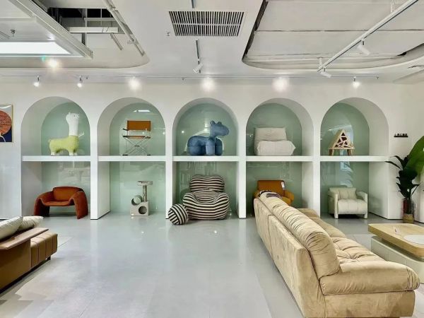在这座卖场中,猫窝的位置也尤为优越。盘踞主厅电梯位,猫窝处在卖场4层的客流必经路线,总面积约1200平方米。小编实地探访了解到,在门店设计上,猫窝有机融合了古城西安的拱门、藻井等城市建筑文化元素。同时,猫窝不再按照品牌划分区域的传统方式,而是用奶油风、意式极简风、日系原木风、现代简约风等不同的设计装修风格来作区隔,陈设的住宅家具、灯具、宠物家具、餐瓷具、摆件饰品、床品等家居产品,均为线上高销量产品,是被消费者验证过的“网红爆款”,能够一站式满足当前消费者偏向年轻态、场景式、沉浸式的家居购物需求。