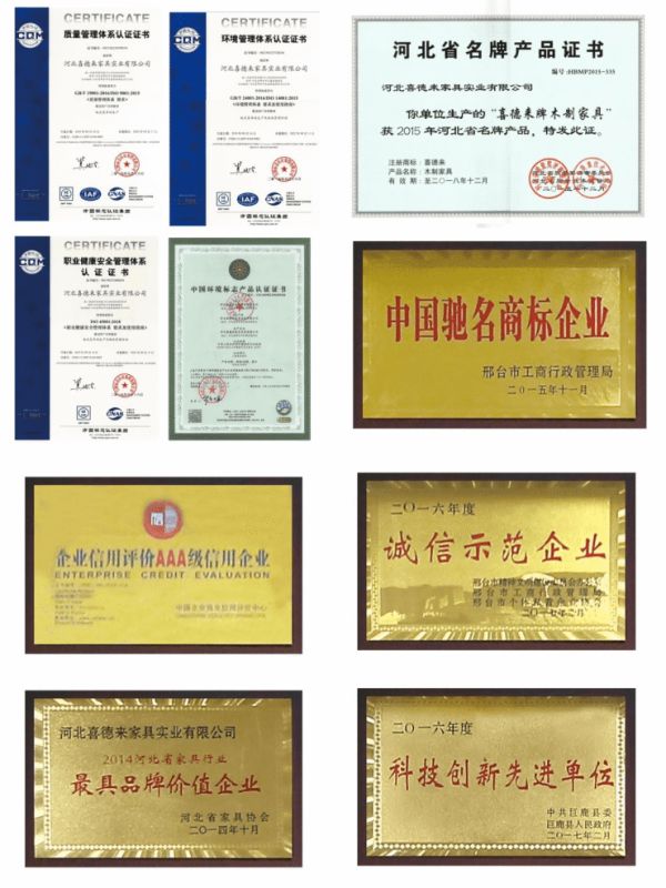 36年匠心兼程,喜德来坚守环保与质量,多次荣获“河北省名牌产品”、“中国十省市‘环保’家具市场知名品牌”、“中国放心购标志品牌”等荣誉称号。此外,喜德来通过了“中国环境标志产品(十环)认证”,并全面通过了ISO9001质量管理、ISO14001环境管理和ISO45001职业健康安全管理体系认证,全部车间均有环评许可证,环境管理体系与质量管理体系均已得到国家认可。