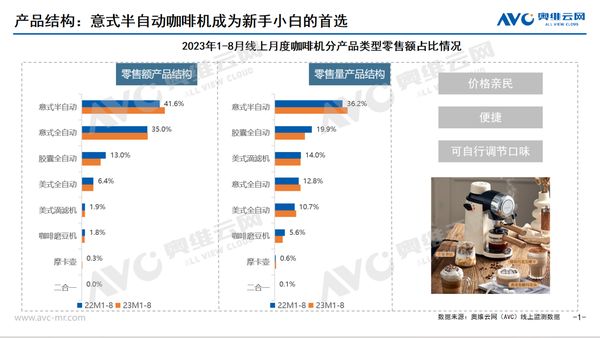根据奥维云网2023年1-8月线上数据,意式半自动咖啡机额量较去年同期均有增长,总体来看,意式咖啡机零售额规模提升10.6%,美式咖啡机零售额规模提升3.5%。