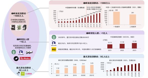 中金点睛测算得知,中国咖啡市场已经出现购买家庭咖啡机的约1000万咖啡重度消费者;以及主要由一二线城市现磨咖啡店高频客户组成的约1亿咖啡常饮消费者。