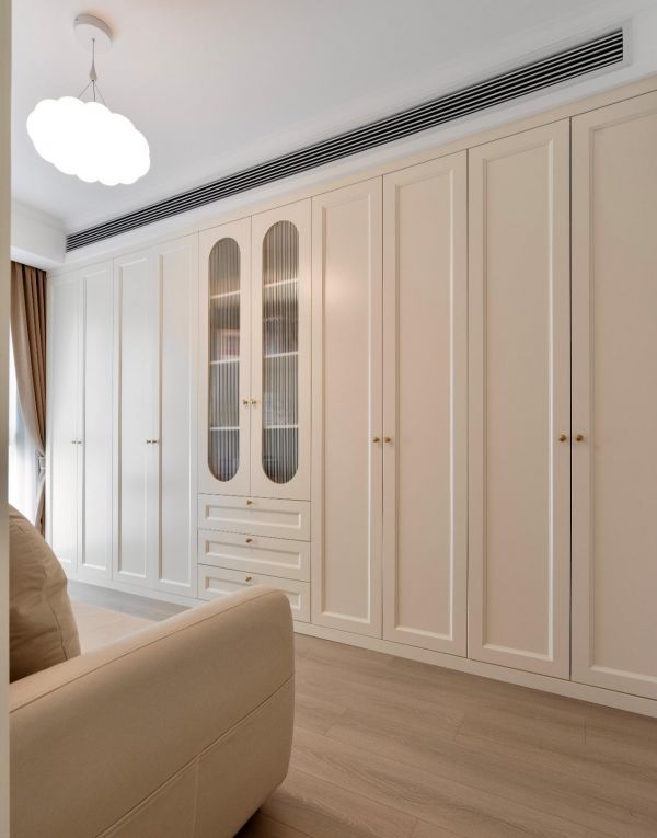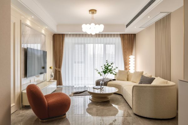 业主是个优雅的独立女性,客厅整体覆盖着奶油白的治愈色调,温馨舒适,热烈的珊瑚色点缀在白色背景下。空间规划皆是考虑到生活的需求,展现了大女主的优雅与干练。
