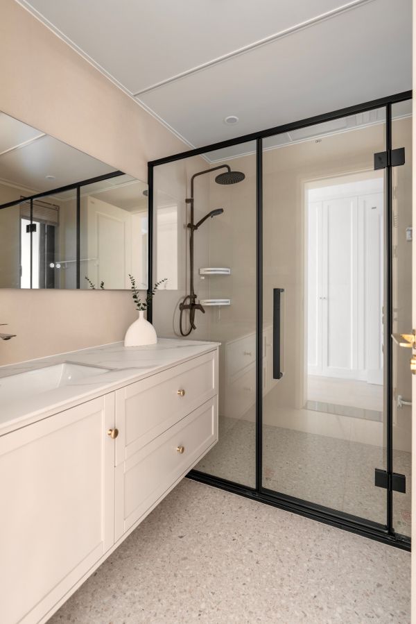 运用了石材和护墙的组合兼具时尚和典雅,隐形门的设计功能融合。