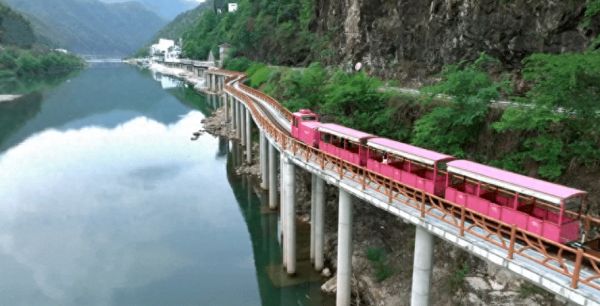 乘着粉色的慢慢吞吞小火车,穿梭在青山绿水之间,若是恰逢烟雨的天气,山间会萦绕着一朵朵云雾,仿佛真的置身于云朵之间。