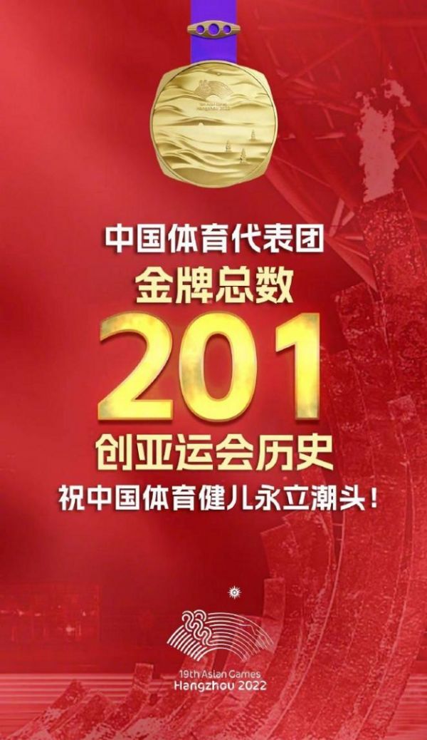 历时15个正式比赛日的激烈角逐,中国亚运天团以201金111银71铜的绝对优势完美收官,位列金牌榜与奖牌榜双榜首。中国亚运健儿在各个项目中顽强拼搏,为中国赢得了无数的荣誉和奖牌,不仅在亚洲体育竞技舞台上赢得了广泛赞誉,同时传递了拼搏奋进的体育精神,为中国体育事业的发展贡献了力量。中国亚运健儿在比赛中超越自我、挑战极限的高燃瞬间向世界展示了中国体育的强大实力,也给我们带来了许多感动,为中国感到骄傲与自豪!