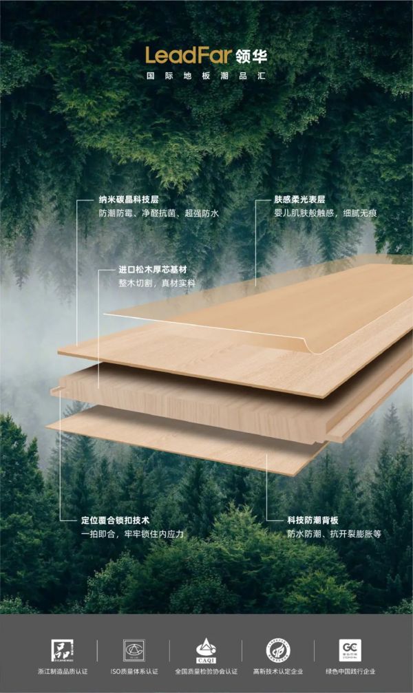 领华地板把绿色创新生产理念贯彻落实到行动中去,严格按照绿色产品的高标准执行生产,健全整个企业的绿色发展体系。屡获”中国地板行业环保健康品质金山奖“、“中国地板设计风尚奖“等多项荣誉,加倍努力创新技术、规范生产、保障品质,以绿色发展的榜样,全面推动地板产业迈向新台阶,助力我国绿色产品事业高质量发展,打造南浔木都城市响亮名片!