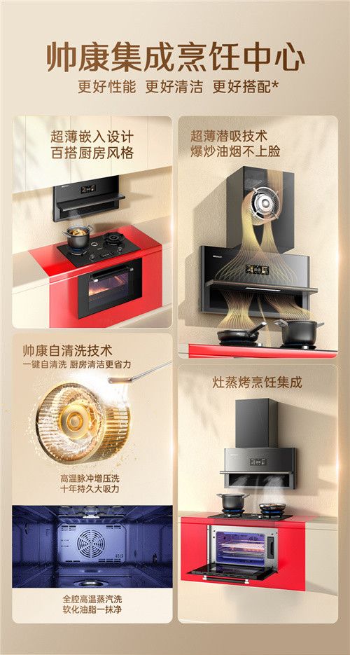 帅康集成烹饪中心Q5S+QY5的“更好性能”是恰到好处的理性集成,而并非是功能和技术的盲目叠加,这体现在烹饪的集成、性能的升级上,灶与蒸烤炸的集成,实现了同步烹饪,十项功能的集成,在平米间给用户带来更便捷的体验。“更好搭配”是产品的细节设计以及与橱柜的出色的搭配方案,符合用户对高颜值的追求。“更好清洁”是产品自身具备自清洗功能,让用户清洁更省心省力。