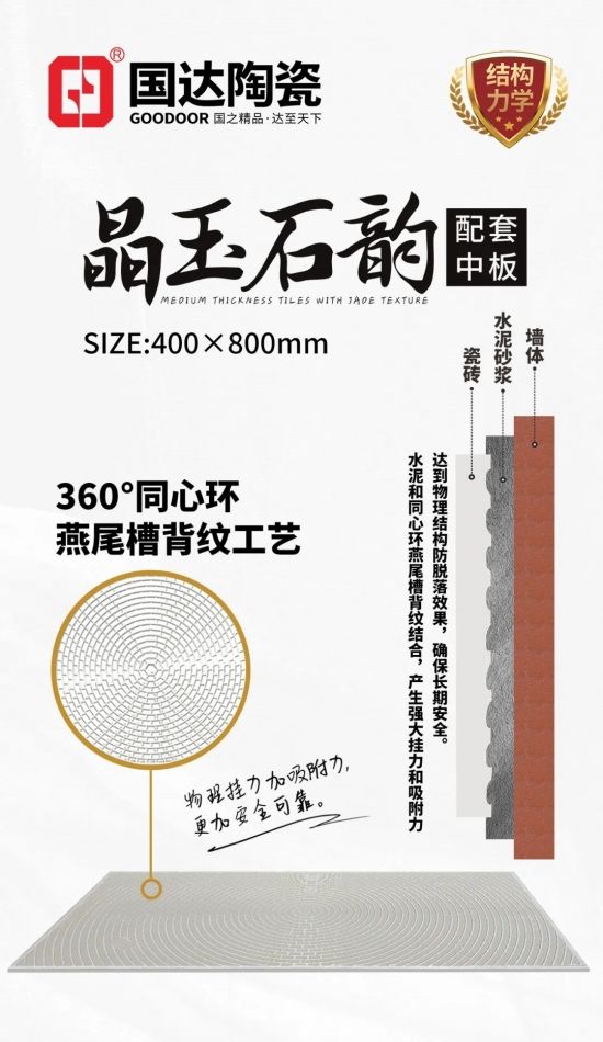 晶玉石韵配套中板的背纹由多个燕尾槽形成同心环排布,燕尾槽朝着不同方面,整个背纹版面形成360度无死角区域,燕尾槽夹角往中间倒扣,在水泥膨胀过程,从任何角度都能牢牢把瓷砖给扣住,提升瓷砖粘贴过程的物理挂力和抓附力,从粘性力升级为结构力上墙,解决了瓷砖脱落的痛点问题,确保瓷砖长期安全稳固。