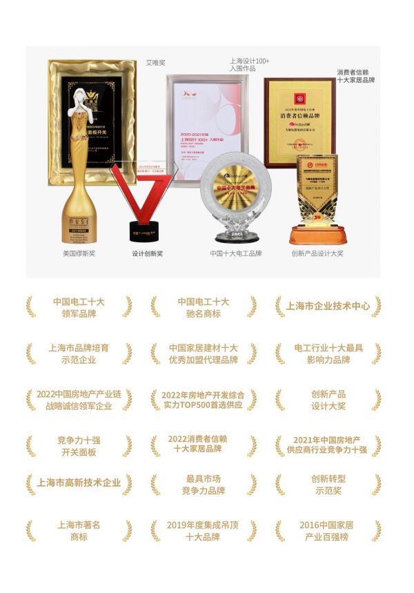 飞雕品牌也一直秉承绿色、环保的生产理念,率先通过ISO14001和OHSAS18001标准体系认证,拥有注册商标108件,先后荣获 “中国电开关行业标志性品牌”“上海市名牌产品”等荣誉称号,并于2021年荣获“中国电工行业十大领军品牌”“中国电工行业消费者信赖品牌”等荣誉称号。