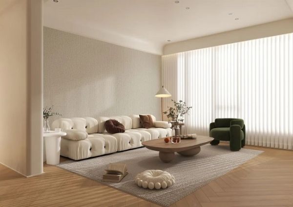 浅灰的肌理墙布,麝绒的面包沙发,营造出空间的洁净无瑕,此时一袭原木带来了温暖的热量,加上长绒地毯的搭配,在天气转凉之季,随心在客厅玩耍都不用畏惧寒意。