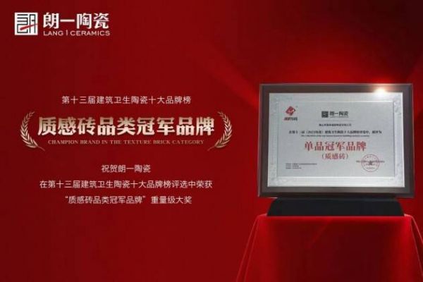 2023年6月,朗一荣获质感砖单品冠军品牌,进一步确定朗一陶瓷在质感砖品类的话语权。