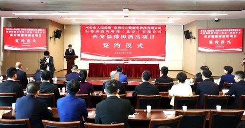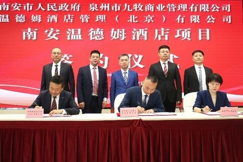 10月13日,南安首家国际高端品牌酒店——南安温德姆酒店项目签约仪式在南安市政府隆重举行。南安市委书记张桂森、市委副书记、市政府市长王连赞、市人大常委会主任黄景阳、市政协主席庄国阳,南安市委常委、副市长陈倩;温德姆酒店集团大中华区业务发展部首席发展官王磊,温德姆酒店集团大中华区业务发展部总监李大凯;九牧集团党委书记、董事长林孝发;南安唐道商业管理有限公司董事洪星福以及南安市各相关部门负责人和各参会单位的其他代表及媒体记者共同出席签约仪式。