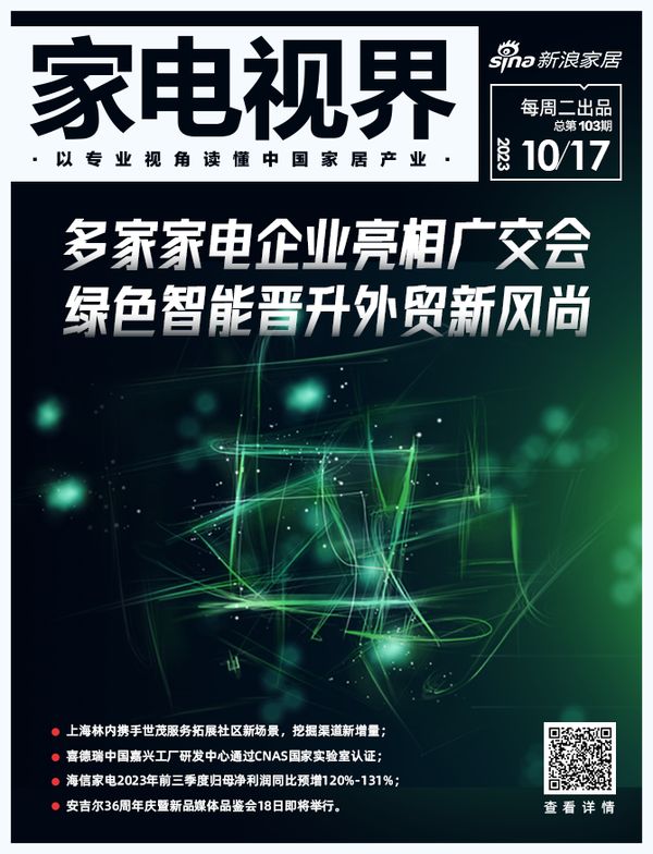 多家家电企业亮相广交会,绿色智能晋升外贸新风尚;安吉尔36周年庆暨新品媒体品鉴会18日即将举行;上海林内携手世茂服务拓展社区新场景,挖掘渠道新增量;喜德瑞中国嘉兴工厂研发中心通过CNAS国家实验室认证;海信家电2023年前三季度归母净利润同比预增120%-131%;海尔智家与佛瑞亚旗下迈极瑞达成战略合作……一周精彩全在新浪家居家电视界,不容错过。
