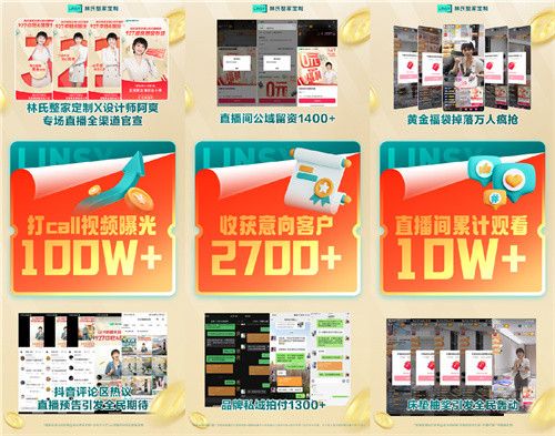 在本次国庆营销中,林氏整家定制在前端的营销版块通过“互联网平台”工具,从线上渠道获取流量赋能线下门店留资,甚至引流到店,构建“线上+线下”的留资生态——比如在活动期内持续不断的优质内容输出、在天猫、抖音等多平台传播内容的整合上下功夫;且通过多类型投流素材测试优化降低成本,林氏整家定制能够实现“门店0元领留资”。在林氏家居整家事业部总经理雷之冠接受外界采访时,就表示:林氏整家定制能够提供给线下门店的流量已经占到其成交总量的60%-70%。