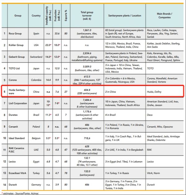在《陶瓷世界评论杂志》(Ceramic World Review)发布的全球卫浴行业大玩家(The big players in the sanitaryware sector)榜单中,惠达卫浴作为中国唯一的卫浴品牌强势登榜,排名高居总榜单第六位。