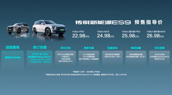而广汽传祺新能源全尺寸SUV——传祺新能源ES9,也在10月1日正式开启预售。新车搭载高热效率2.0TM发动机+GMC400+25.57kWh电池包,CLTC纯电续航达143公里,堪称30万内最好的新能源SUV。此次预售共推出4款配置车型,预售价区间为22.98万-26.98万元;一向贴心的广汽传祺同步开启预售7重礼,宠用户所需。硬核的产品力加上暖心的预售政策,让传祺新能源ES9预售仅7天,订单便突破3000辆,赚足市场期待。