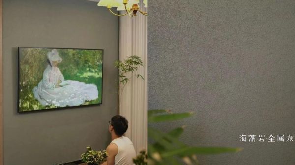 黑子选取了重灰调中带着一丝绿色的海藻岩效果“金属灰”,用于客厅中较小的电视墙部分,与绿植相映成趣,清晰立体的纹理还起到提升整个墙面高级感的效果。