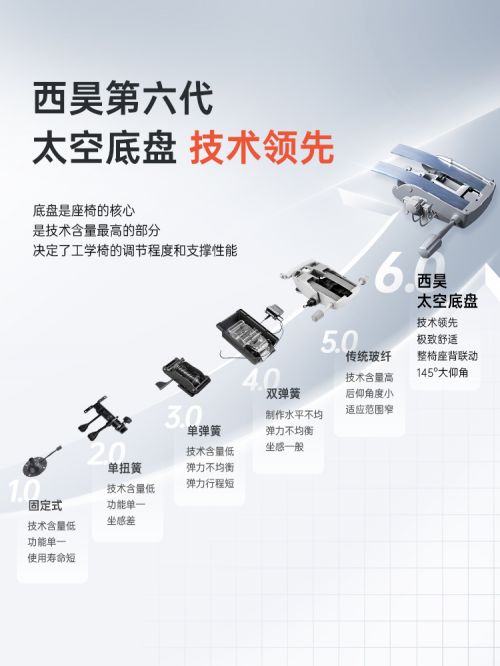 在100多位研发工程师的技术攻关下,终于在2022年9月,西昊掌握了最新的第六代玻纤弹片底盘核心科技,成功推出了第一代“太空底盘”,打破传统底盘舒适度不佳、后仰角度小、弹力不均匀、适应范围窄、材料易疲劳的技术难题,实现了舒适坐感与健康支撑的双重飞跃。