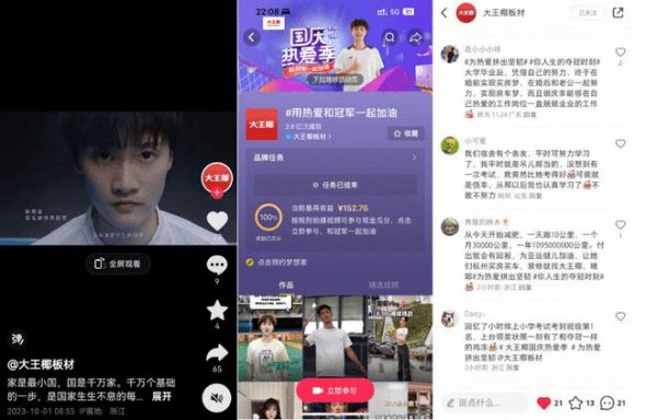 为提升品牌声量和竞争实力,构建用户品牌认知,增强终端经销商信心,大王椰围绕“健康力量”、“坚韧品质”等内容进行策略制定,在9月19日至10月8日期间,推出了为期18天的“国庆热爱季”传播活动,与B端及C端用户充分建立链接,强化了品牌印记。通过线上多平台布局话题讨论、互动抽奖,线下全终端推出惠民定制服务,大王椰在提升品牌声量和促成商业转化率方面取得了不俗的成绩。其中,抖音全民互动卷起运动热潮,全网参与人数2.2w,话题曝光2.6亿。