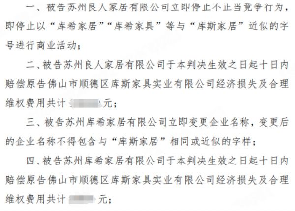 2021年,库斯家居发起了对江苏省(简称)苏州库希公司(包括苏州库希家居有限公司、深圳良人家居有限公司、苏州良人家居有限公司)库希商标侵权及不正当竞争行为实施了法律维权行动,根据广东省龙岗区人民法院做出的“(2021)粤0307民初28869号民事判决书”判决结果显示,(下图为审批书截图)。