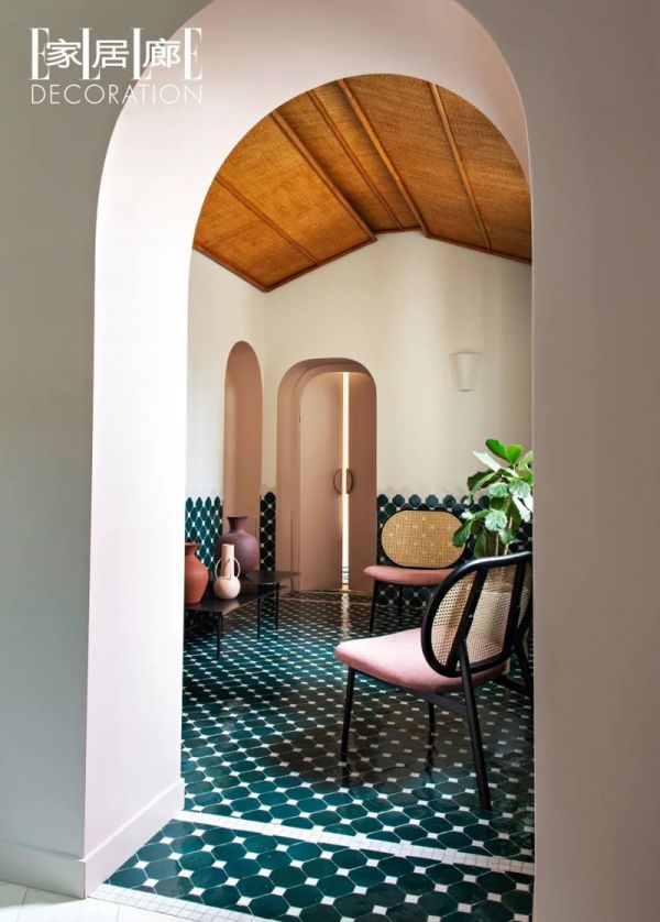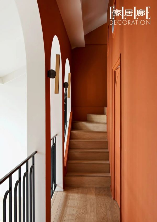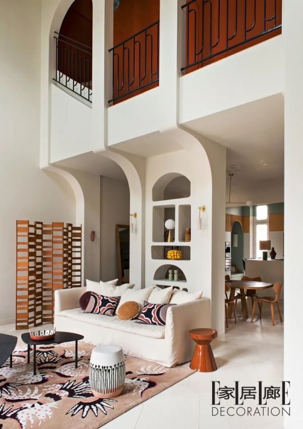 垂直和水平角度组成的动线,加上三层复式建筑内不同空间的视角变化,更显生动。石膏材质的拱门和有机形状的细木制品柔化了结构元素的线条。
