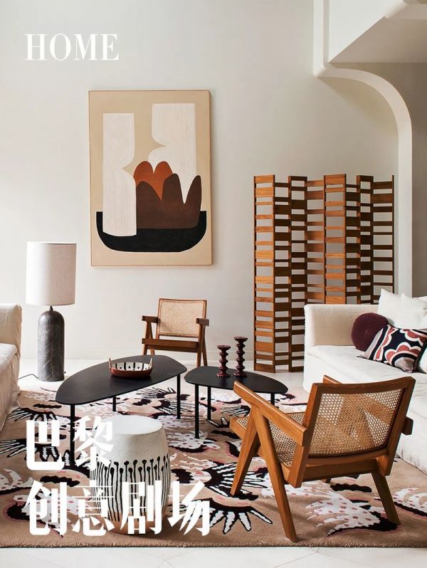 楼梯的另一侧,手工艺大师Franc?ois Passolunghi制作的藤制隔挡占据C位。客厅更像是一个名副其实的开放式舞台,尽管拥有惊人的挑高,但巨大的法式落地窗配上浅色窗帘,辅以白色墙面,整体仍然给人一种亲切感。