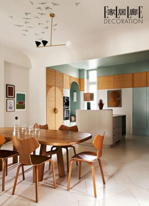 厨房、餐厅区域令人重拾内心的平静。实木餐桌周围一圈摆放着GrandPrix餐椅,1957年由Arne Jacobsen设计(FritzHansen)。天花板上的装饰画由GCG建筑事务所设计、Jeanne Boyer绘制。Balancing吊灯出自Atelier Areti。