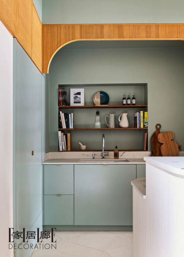 定制厨房采用了一系列中性色面板和GCG建筑事务所设计、Franc?ois Passolunghi制作的藤制面板。兼具吧台功能的中央岛立面则使用白色漆面条痕木材,风格别致。