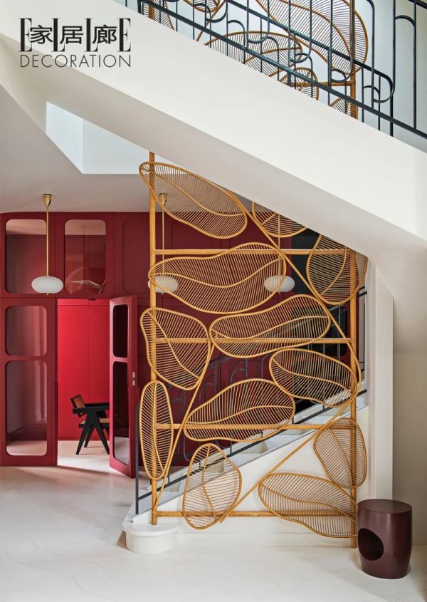 入门处,通往楼上二层的阶梯前,装饰着Francois Passolunghi制作的藤制隔挡和金属栏杆(两者均由GCG建筑事务所设计),边上是Koldi芒果木上漆圆凳(AM.PM)。镶有玻璃的大块红色漆木板(Farrow&Ball的Radicchio色)将更衣室、盥洗室和书房巧妙掩藏。石质地板(Piedra Paloma)的排列布局由GCG事务所设计。