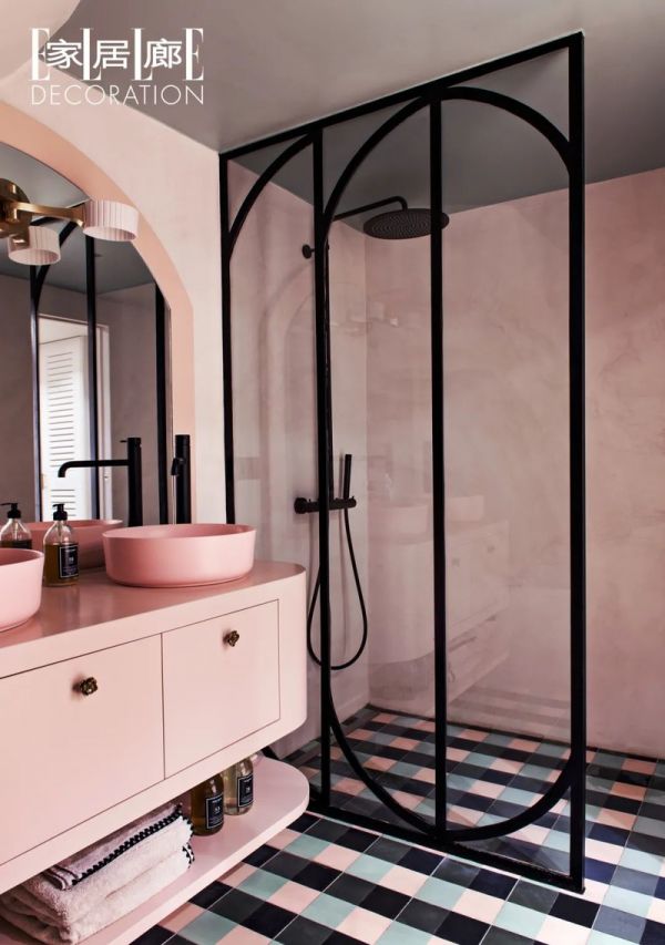 浴室,粉刷有Veneto涂料(Argile)的定制家具,安装了Kasia把 手(Anthropologie)。粉色水池(masalledebain.com),Triverde水龙头(Cristina&Ondyna)以及Jordi Blasi设计的Brahma壁灯。