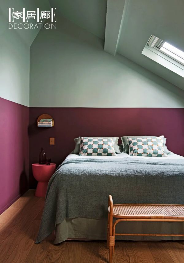 位于三楼的主卧,墙面选用了对比鲜明的色调(Gre?s des Vosges、Ce?ladon和Blanc deMeudon,Argile)。Tam Tam粉红色漆面矮凳(Pols Potten)和Archal黄铜半月形搁架(ENOstudio)相映成趣。Jack天然藤条床尾凳(Saudara Collections)、亚麻床单(Lissoy)和羊毛毯(Society),以及 Borsalino靠垫(E?litis)等浅色物件让卧室显得格外宁静。