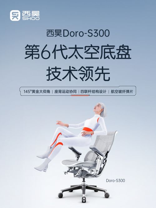 通过不懈钻研,西昊最终实现技术落地,于2022年成功推出搭载了第六代太空底盘技术的革新力作Doro-S300。太空底盘与传统弹簧底盘不同,创造性地采用航空玻纤弹片,具有高强度的力学特性、安全特性和耐久特性,能够平衡人体支撑力和自重力,减少使用者背部和腿部肌肉的拉伸程度。