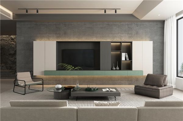 客厅设计简约,线条简练,色彩古朴,给人一种宁静自然、气韵生动的氛围感。悬浮组合电视柜落落大方,深木纹与苍蓝相接,幽深而不沉闷,静谧美好,让人不自觉联想到陶渊明笔下的“结庐在人境,而无车马喧”,材质上选用多层板贴黑胡桃木皮材质的长城护墙板,散发一种大自然的气息,起伏的栅格,使空间充满立体感和节奏感。背墙收纳区设计有不同高度的开放格,小孩、老人取放物品更方便,电视柜下方还设计了扫地机器人收纳区,满足现代家庭的智能产品收纳需求,缔造永不过时的简约时尚家居。