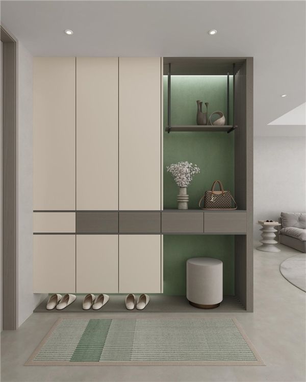 玄关采用苔古绿+杏子米撞色设计,清雅中暗藏着生机,步入其间,如竹林穿行。同时,采用金属吊架做点缀,便于摆放心爱的饰品,开启自然温馨的归隐生活。