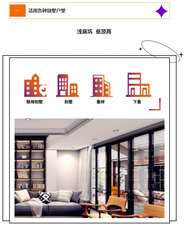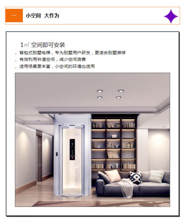 背包式别墅电梯,作为专为别墅用户研发的结构,更适合别墅装修,有效利用井道空间,减少空间浪费,适用场景更丰富,小空间的环境也适用,多方面都较传统结构更合理、更优化。