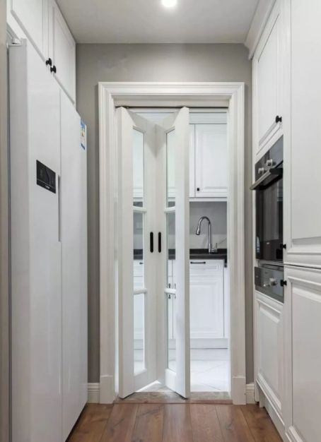 像开放式的厨房,不装门就无法通过燃气公司的检查,基本功能性没保障;装门又丢失了开放式厨房的设计感。那我们就装一个隐藏的折叠门,日常就把折叠门藏起来,满满的设计感。