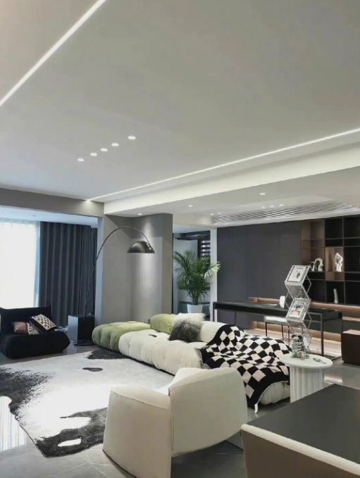 在极简风的装修中,天花做成吊平顶,若再吊一盏灯下来的话,就会影响设计感,把光源藏起来,保持简洁的设计感,见光不见灯的无主灯设计,就成了一种主流的照明方式。