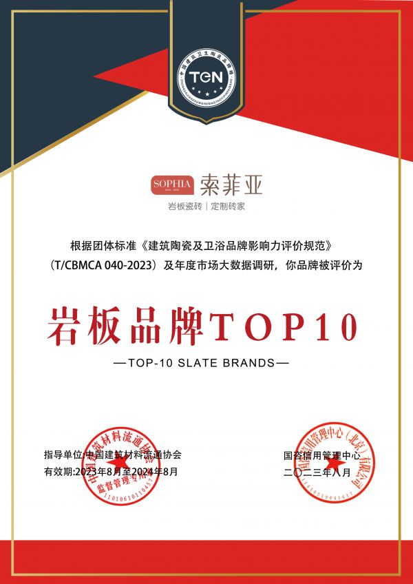 近日,由中国建筑材料流通协会、国咨信用管理中心主办的中国陶瓷行业品牌发展成果评选活动中,索菲亚岩板瓷砖凭借强大的综合实力,一举斩获“岩板品牌TOP10”重量级大奖,这是行业对索菲亚企业实力和品牌影响力的再次肯定。