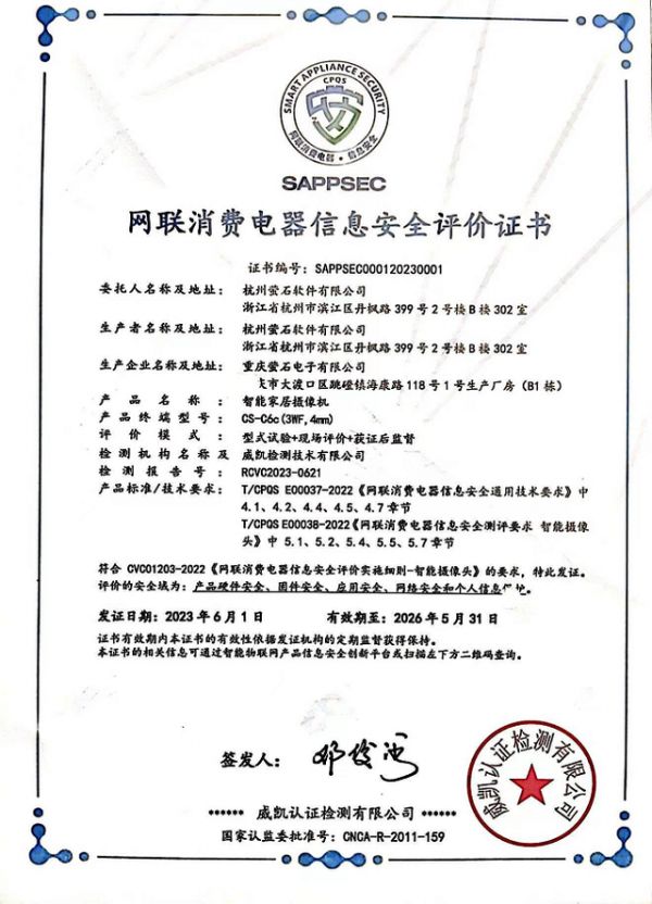 此外,萤石C6c智能家居摄像机获颁了网联消费电器信息安全评价证书。萤石以安全为根基,安全认证覆盖了全球安全标准,具备了体系化的安全能力,获得了云安全国际认证(CSA-STAR)、信息系统安全等保3级等证书,并通过了ISO 27001、ISO 27017、CSA STAR 、ISO 27018、ISO 27701、ISO 29151、ISO 22301等主要标准体系,具备支持客户承建重大项目基础资质。近期,萤石还与同字节跳动等6家企业获颁中国质量认证中心首批“物联网产品网络安全证书”,同时萤石也是智能家居行业首家“数据管理能力认证DsMC”获证单位。
