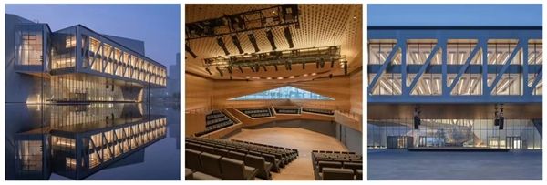 音乐学院主体建筑由4座多立面面场馆组成,内设一座大型音乐厅、演奏厅、黑盒剧场以及行政、教职人员和排练空间。4座场馆作为学院主建筑的基⽯,5座玻璃廊桥则横跨于开阔的公共空间之上,环绕而成的无柱空间面积达2,260m²,成为教学楼的“中堂”区域。音乐厅面积810平方米,大厅采用桉木饰板包覆,营造出温馨的混响环境。拉起玻璃幕墙上的电动遮阳帘,即可将海河作为演出的壮丽背景。机械化高架照明装置可为音乐会舞台和音乐家提供最佳的照明效果。演奏厅面积440平方米,采用此类型私密演奏厅中少见的桉木镶板包覆和环绕式布局,透过舞台后面的玻璃幕墙,可以俯瞰附近的公园和倒影池。