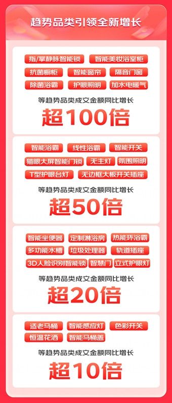 在消费者对智能、健康生活的多样化诉求及个性化审美偏好驱动下,众多新趋势类建材品类人气高涨。京东11.11现货开卖28小时,指/掌静脉智能锁、智能美妆浴室柜、抗菌橱柜、智能窗帘、隔音门窗、除菌浴霸、护眼照明、加水电暖气等品类成交金额同比增长超100倍;智能浴霸、线性浴霸、智能开关等品类成交金额同比增长超50倍;智能坐便器、定制淋浴房、热能环浴霸、多功能水槽、垃圾处理器等品类成交金额同比增长超20倍;适老马桶、智能感应灯、色彩开关、恒温花洒、智能马桶盖等品类成交金额同比增长超10倍。