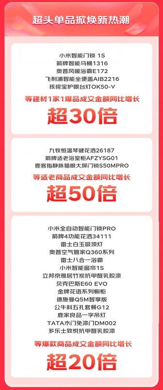 凭借过硬品质、环保用材、独特设计、创新功能等亮点,众多大牌建材爆款成为消费者焕新的热选。京东11.11现货开卖28小时,小米智能门锁1S、箭牌智能马桶1316、奥普暖浴霸E172、飞利浦智能坐便盖AIB2216、孩视宝护眼台灯OK50-V等建材1家1爆品成交金额同比增长超30倍;九牧恒温琴键花洒26187、箭牌适老浴室柜AFZYSG01、鹿客指静脉猫眼大屏门锁S50MPRO等适老商品成交金额同比增长超50倍。与此同时,雷士白玉吸顶灯、立邦京雅居竹炭抗甲醛乳胶漆、贝克巴斯E60 EVO、德施曼Q5M智享版、公牛斜五孔套餐G12等爆款商品成交金额同比增长超20倍。