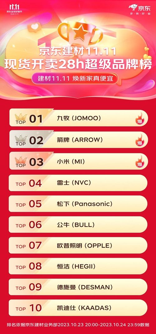 真便宜、闭眼买的实惠价格,以及不用等的现货开售玩法,获得了消费者的热忱回应。众多建材品牌携手京东再创佳绩,京东11.11现货开卖28小时,九牧、松下、小米、高仪、贝克巴斯、汉斯格雅、惠达、瑞尔特、东鹏、诺贝尔、智米、新豪轩、浪鲸、海尔、鹿客、鹿家良品、鲁本斯、维盾门窗等品牌成交金额同比增长超50倍;箭牌、恒洁、TOTO、多乐士、霍尼韦尔等品牌成交金额同比增长超20倍;德施曼、凯迪仕、公牛、奥普、欧琳、奥克斯、悍高、顾家家居、四季沐歌等品牌成交金额同比增长超10倍。