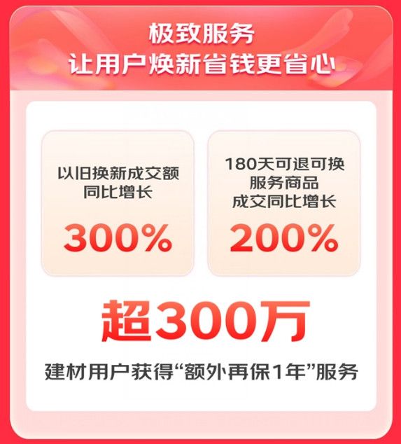 为了带给消费者一站式焕新家的省心体验,京东11.11期间推出了多项人性化服务。比如,消费者换新马桶、浴室柜等建材产品,可享至高立减10%的以旧换新补贴;建材百大爆品还免费延长保修1年,再加上180天可退可换服务,让消费者后顾无忧。京东11.11现货开卖28小时,建材产品以旧换新成交额同比增长300%;180天可退可换服务商品成交同比增长200%;超300万建材用户获得“额外再保1年”服务。