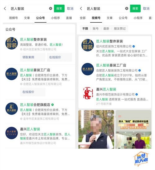 视频号探索同样是匠人智装的重点发展方向,多维度布局创意、案例等账号矩阵,希望为消费者提供更多可视化的案例,打造更好更全面的服务体验。